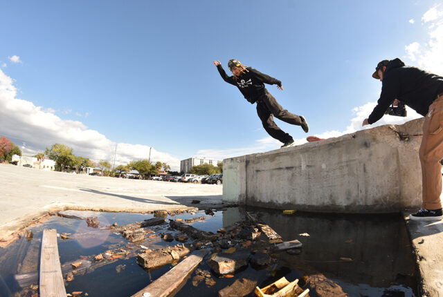 A bunch of people travel into town every year to skate it for the Bash, and this year was no exception. We had homies from Colorado, North Carolina, Florida, and probably other places I just didn’t hear about as well. Even those who don’t skate vert will come out and just watch the show, and it is a damn good one every year. The days leading up to/following the Bash, the other backyarders and spots all over town also get pretty torn up by the travelers and locals alike. The first spot in the edit is a concrete bowl around the corner from Hanks owned by our buddy Ed Peck. Double waterfall bowl with hips galore.