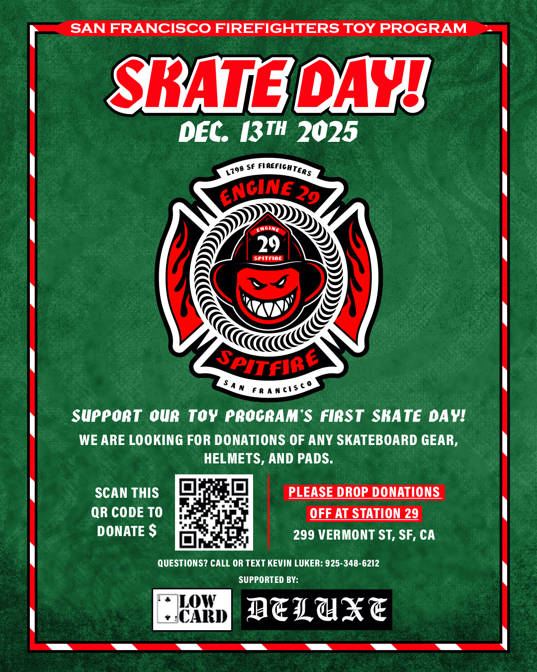 Mark your calendars, on December 13th the SF Fire Department is hosting its first skate day! As part of their annual toy drive, the SFFD has partnered with Lowcard and DLXSF to get Bay Area kids hooked up with a tune up to their skateboards. You could be eligible to get all sorts of new parts you might need for the holiday season, so come on down to the event where you just might get to see Santa ollie a fire hydrant.